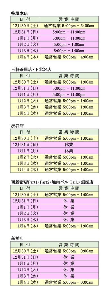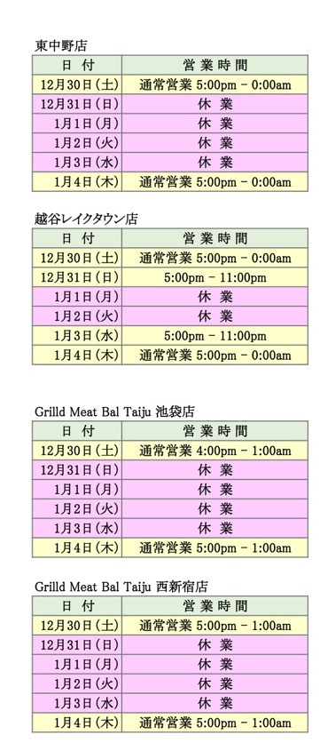 2018-2019 年末年始営業のご案内 焼肉DINING太樹苑各店とGrilld Meat Bal Taijuは年末年始に限り、以下の通りに営業時間を変更させていただきます。 お客様にはご不便・ご迷惑をお掛けいたしますが、よろしくお願いいたします。 2018年12月6日更新: 2018年12月6日Author: cmsadminカテゴリー: 太樹苑からのお知らせ