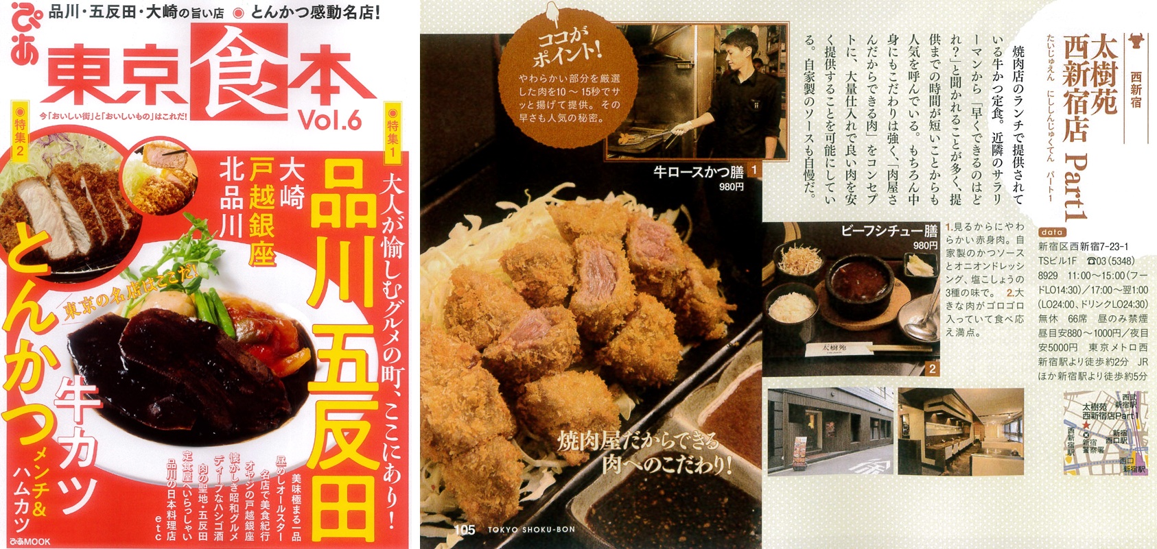 ぴあ東京食本にランチ 牛ロースかつ膳が掲載されました 2018年7月30日更新: 2018年8月10日Author: cmsadminカテゴリー: 太樹苑からのお知らせ ぴあ東京食本にランチ 牛ロースかつ膳が掲載されました。 牛ロースかつ膳は、ランチ実施店の 西新宿店Part-1、新橋店 でお召し上がりいただけます。 関連記事 焼肉DINING太樹苑東中野店 臨時休業のお知らせ 焼肉DINING太樹苑東中野店は従業員研修のため、10月9日(火)より10月16日(火)までの間を臨時休業とさせていただきます。 お客様にはご不便・ご迷惑をお掛けいたしますが、よろしくお願いいたします。 焼肉DINING […] 2018年9月27日更新: 2018年8月3日Author: cmsadminカテゴリー: 太樹苑からのお知らせ 焼肉DINING 太樹苑 歓迎会・送別会プランのご案内 お得な歓迎会・送別会プランのご案内です。 太樹苑ならではのサービスと上質な味が魅力。幹事さん必見。焼肉DINING 太樹苑の歓迎会・送別会プランをお楽しみください! お問合せ、ご予約は各店舗へ直接電話にてお願いいたします […] 2018年3月7日更新: 2018年7月26日Author: cmsadminカテゴリー: 太樹苑からのお知らせ 焼肉DINING太樹苑東中野店 臨時休業のお知らせ 焼肉DINING太樹苑東中野店は従業員研修のため、5月7日(月)から9日(水)までの3日間を臨時休業とさせていただきます。 5月6日(日) 通常営業 5月7日(月) 臨時休業 5月8日(火) 休業日 5月9日(水) 臨時 […] 2018年4月26日更新: 2018年7月26日Author: cmsadminカテゴリー: 太樹苑からのお知らせ
