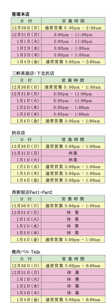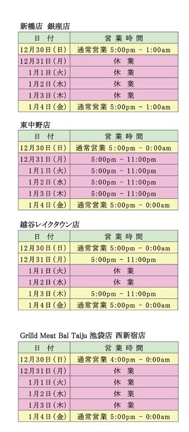 2018-2019 年末年始営業のご案内 2018年12月6日更新: 2018年12月6日Author: cmsadminカテゴリー: 太樹苑からのお知らせ 焼肉DINING太樹苑各店とGrilld Meat Bal Taijuは年末年始に限り、以下の通りに営業時間を変更させていただきます。 お客様にはご不便・ご迷惑をお掛けいたしますが、よろしくお願いいたします。 関連記事 焼肉DINING 太樹苑 忘年会・新年会のご案内 2018年-2019年 お得な冬の忘年会・新年会プランのご案内です。 太樹苑ならではのサービスと上質な味が魅力。幹事さん必見の太樹苑の忘年会・新年会プランをお楽しみください! お問合せ、ご予約は各店舗へ直接電話にてお願い […] 2018年12月1日更新: 2018年12月6日Author: cmsadminカテゴリー: 太樹苑からのお知らせ ぴあ東京食本にランチ 牛ロースかつ膳が掲載されました ぴあ東京食本にランチ 牛ロースかつ膳が掲載されました。 牛ロースかつ膳は、ランチ実施店の 西新宿店Part-1、新橋店 でお召し上がりいただけます。 2018年7月30日更新: 2018年8月10日Author: cmsadminカテゴリー: 太樹苑からのお知らせ 5/18 OPEN! 焼肉DINING 太樹苑 越谷レイクタウン店 埼玉県越谷に焼肉ダイニングがオープンします。 和風モダンな落ち着きのある空間で、銘柄にこだわらず、全国から良質なお肉を厳選して皆様にご提供いたします。 15テーブルの内、1階には8名様と6名様の個室。2階お座敷席は、6名 […] 2017年4月18日更新: 2017年9月12日Author: cmsadminカテゴリー: 太樹苑からのお知らせ